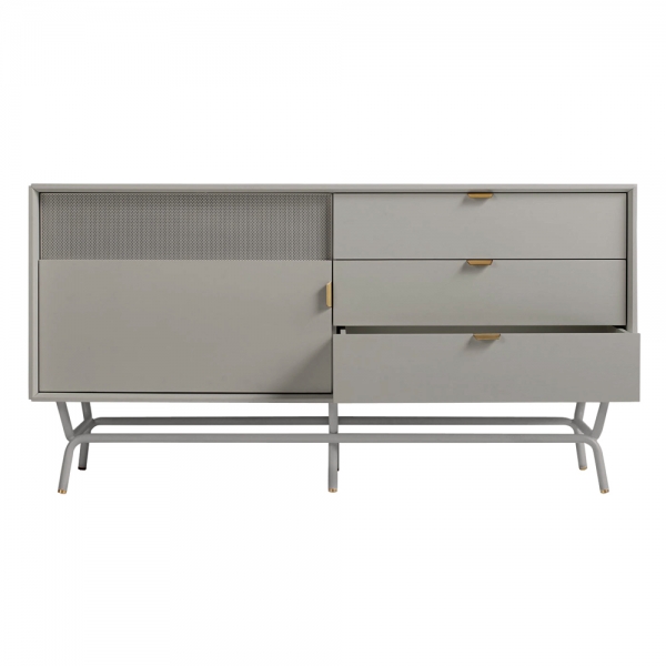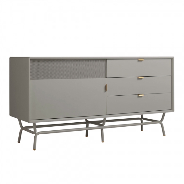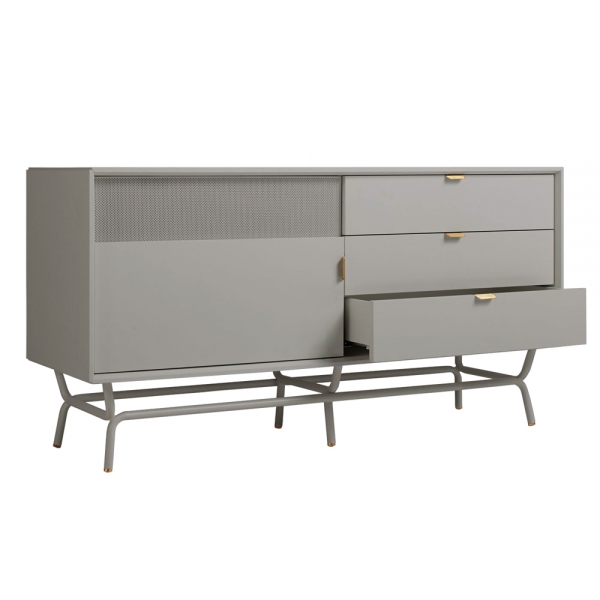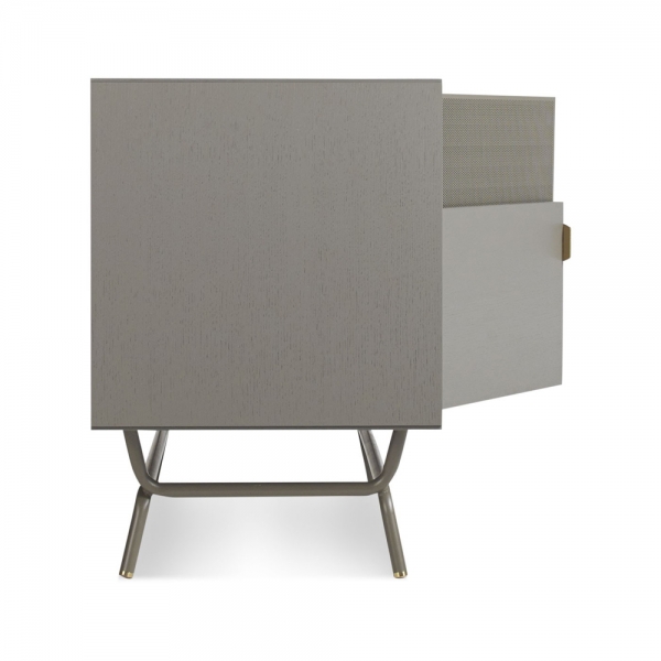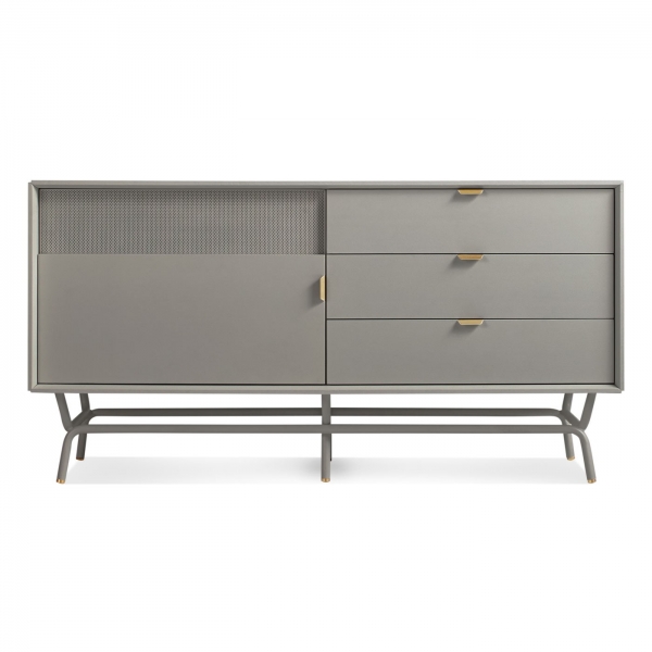 Almost seems a shame to muck it up with a TV. Perforated steel door front allows use of remotes without spoiling the view. Brass details and powder-coated steel base.