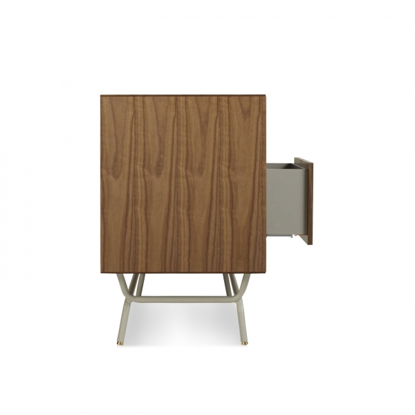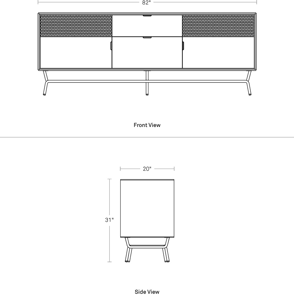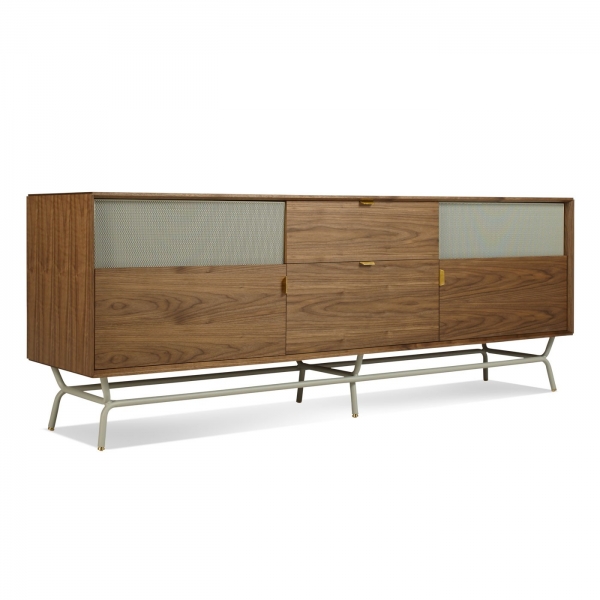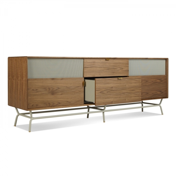 Perforated steel door fronts on this modern credenza allows use of remotes without spoiling the view. Brass details and powder-coated steel base.